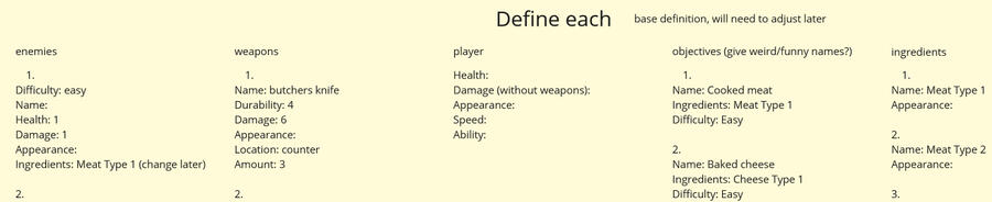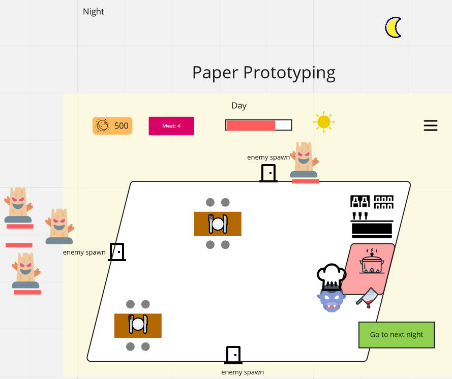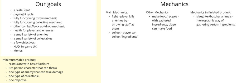 The player plays as an alien and has to take care of a restaurant in outer space. During the day, they get objectives in the form of food orders, in order to fulfill these you need to have collected certain ingredients. During the night, the player needs to protect the restaurant from enemy attacks. These enemies will upon being killed, spawn ingredients needed to fulfill the day objectives. They are, however, not given any proper weapons, so they need to be creative and figure out what in the environment they can use to kill enemies.My contributions: I worked on and implemented the balancing of the enemies, the behaviour of the AI, and the weapons.How many throws until an item breaks?