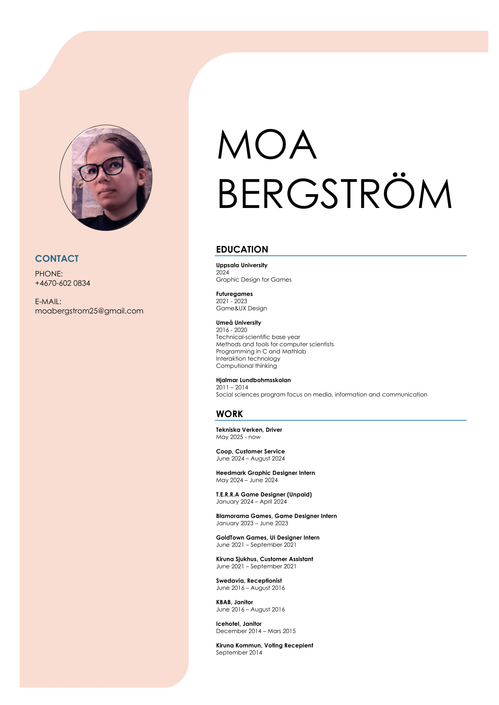 My name is Moa and I'm from Kiruna from the far north of Sweden. I'm currently living in SkellefteƄ.I previously studied Game&UX Design at Futuregames.I studied programming at University (C, Java, Mathlab, Python). I have also worked with C# and Blueprints. I can use Figma, Unity, Unreal Engine, Trello, Visual Studio, GitHub, SourceTree, Perforce and Jira.